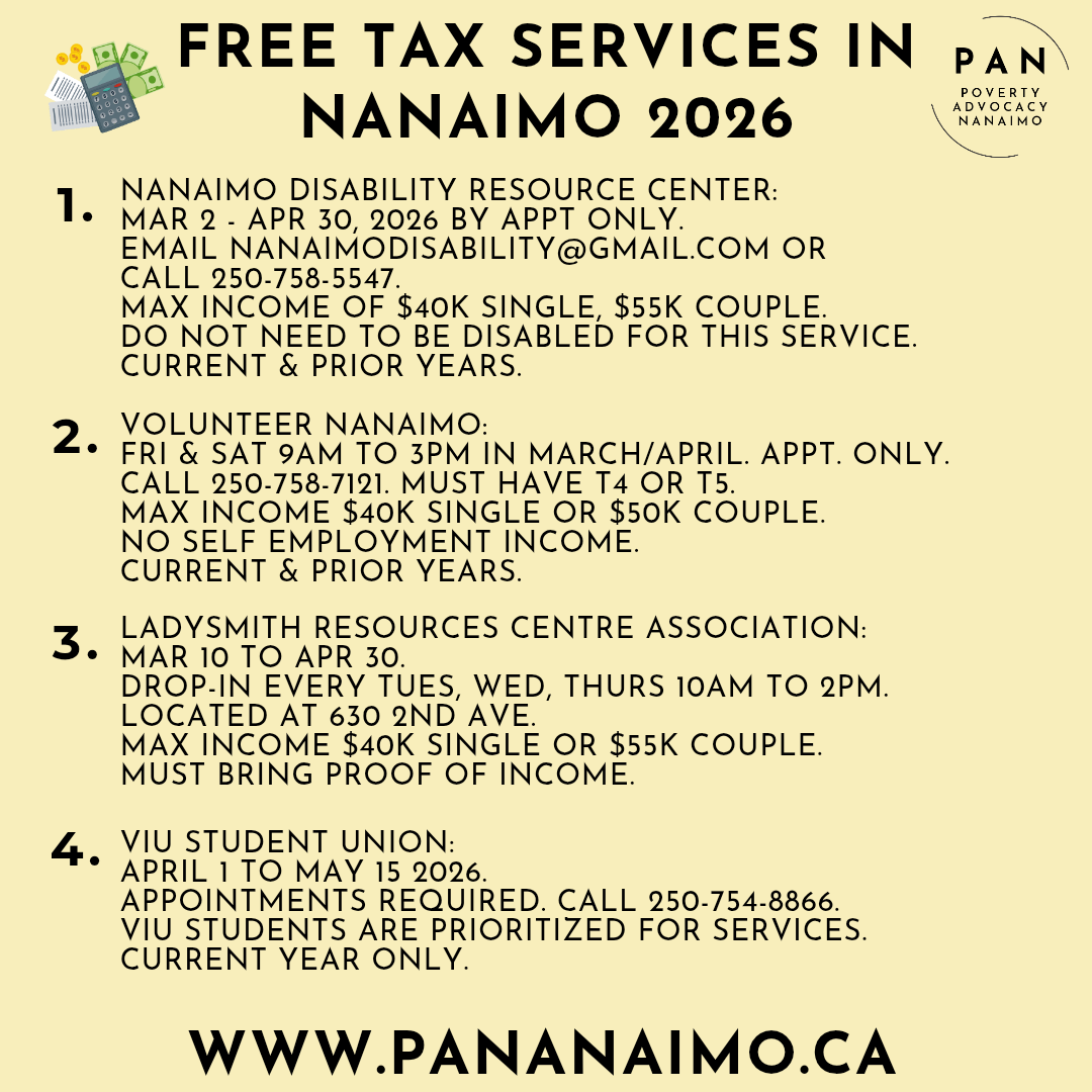 - Poverty Advocacy Nanaimo – Free Income Tax Filing Services – There are several ways to get free help with filing your income taxes—if you’re located in Nanaimo or Ladysmith, check them out! March – April