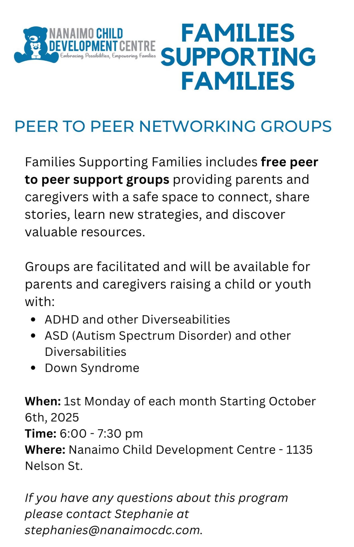 - Nanaimo Child Development Centre – Peer-to-Peer Support Groups – Receive peer-to-peer support with ADHD, autism, Down syndrome, and other diversabilities. First Monday of every month.
